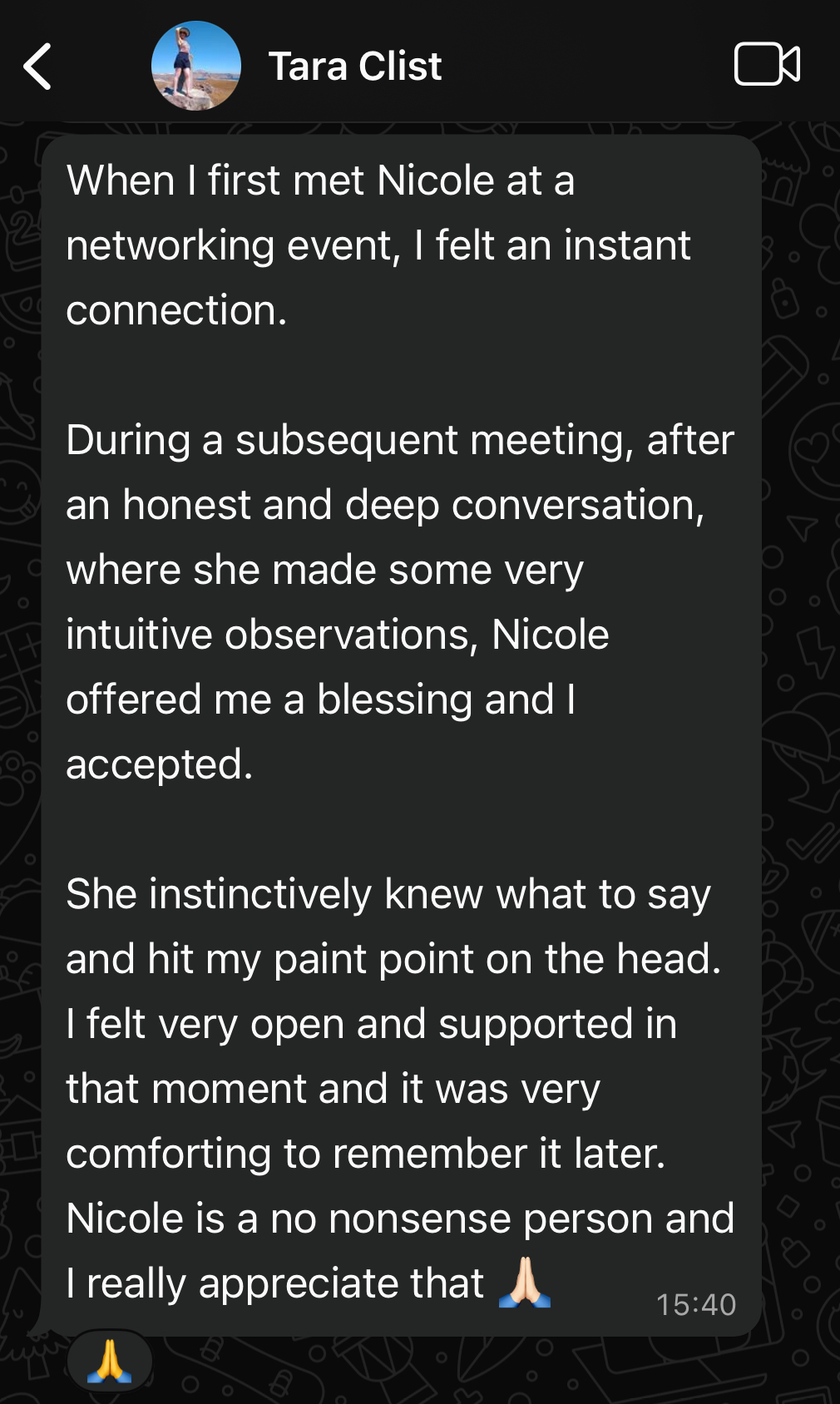 I never know beforehand what I am going to say. I simply place my hands on your heart and allow the Great Mother Goddess to speak through me.