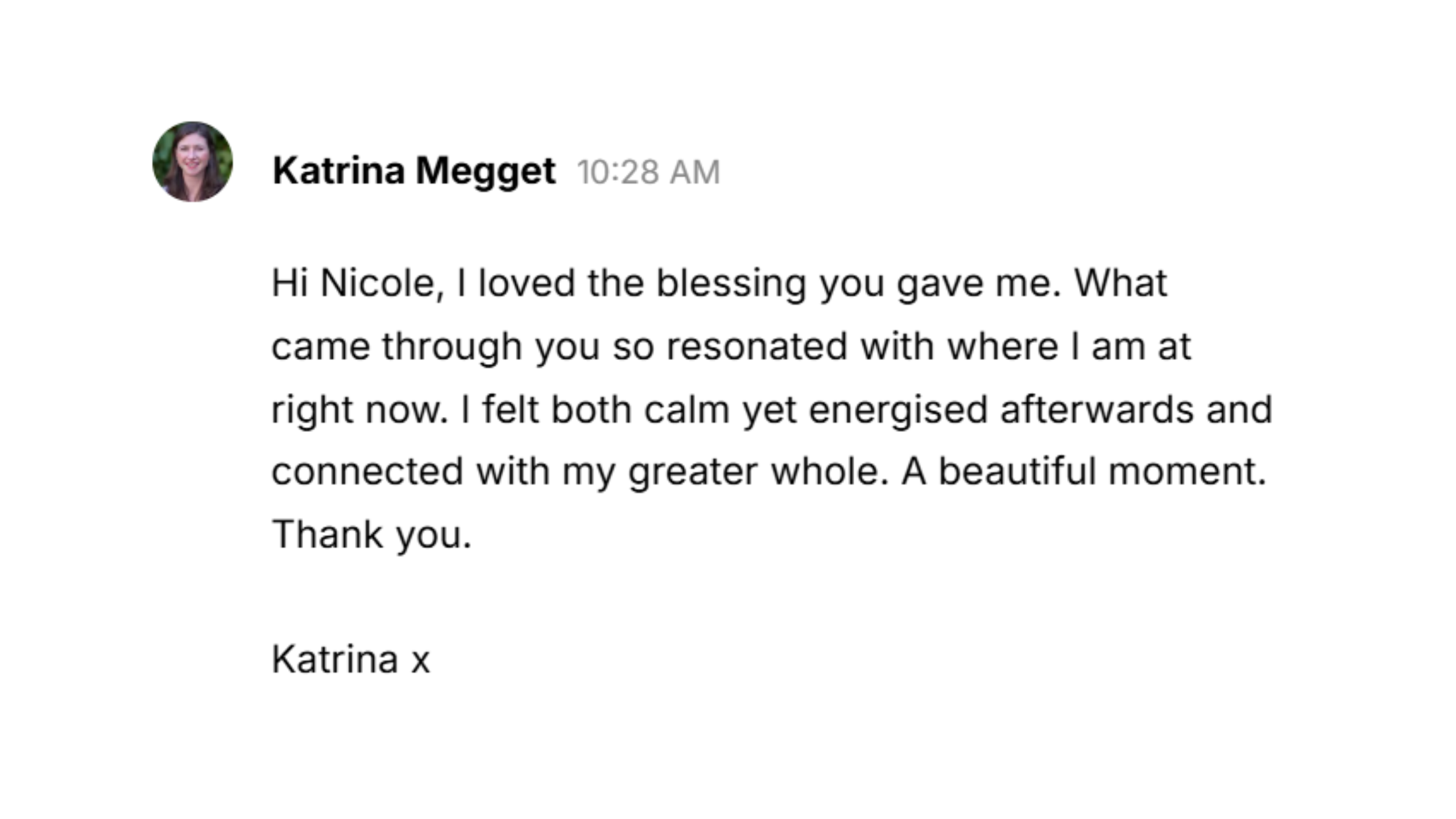 "I received a beautiful blessing from Nicole the other day, which was very powerful and felt like a direct transmission from the Great Goddess herself. I felt it in every cell of my body. Some powerful messages came through as an affirmation of who I am, what I am bringing to the world right now and it gave me some really immaculate guidance that I am on the right path. It felt like a transmission that came through from the Great Goddess into my body. I really felt it and I embodied it. I can't recommend Nicole highly enough."